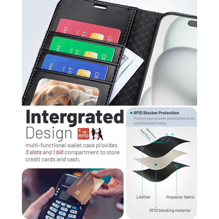 Πολυλειτουργικός Σχεδιασμός. Αυτή η θήκη τηλεφώνου διαθέτει 3 υποδοχές για κάρτες, συμπεριλαμβανομένης μιας διαφανούς θήκης, η οποία είναι ιδανική για την αποθήκευση τραπεζικών καρτών, πιστωτικών καρτών, ταυτοτήτων, καρτών και επαγγελματικών καρτών, καθώς και 1 πλαϊνή τσέπη για μετρητά. Εξοπλισμένη με τεχνολογία θωράκισης RFID, προστατεύει τα δεδομένα της κάρτας σας από κλοπή ταυτότητας με καινοτόμα υλικά θωράκισης.
