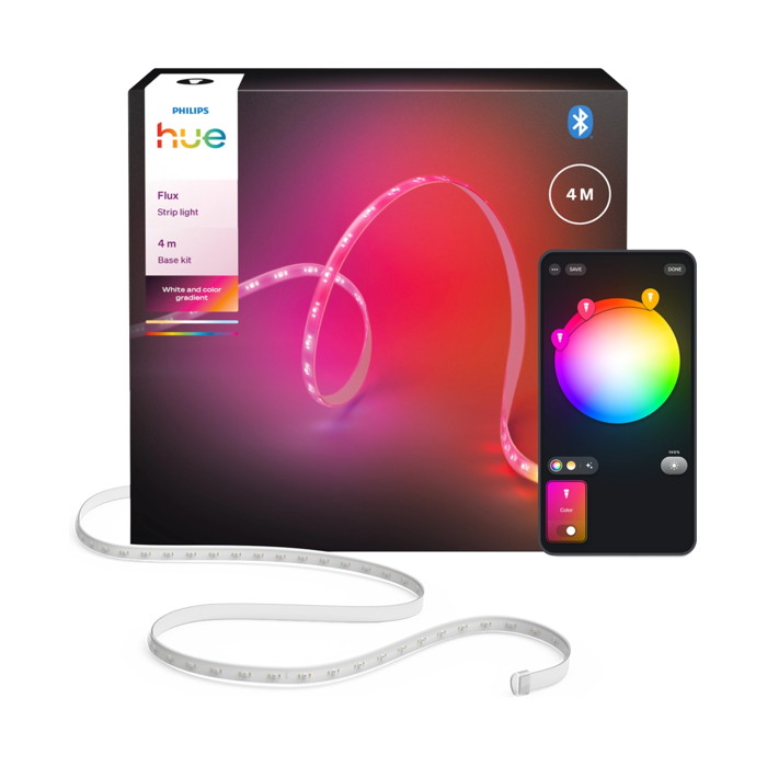 Το Philips Hue Flux Strip Light είναι μια εύκαμπτη ταινία φωτισμού LED εσωτερικού χώρου, σχεδιασμένη για συνεχή φωτισμό ανάδειξης και ατμοσφαιρικό φωτισμό. Υποστηρίζει πλήρη απόδοση λευκού και έγχρωμου φωτός με ομαλή ανάμειξη χρωμάτων και ρύθμιση φωτεινότητας σε όλο το μήκος. Η ταινία παρέχει έως και περίπου 1200 lm, ενώ καταναλώνει περίπου 12W. Ο έλεγχος παρέχεται μέσω Bluetooth ή Zigbee όταν συνδυάζεται με μια γέφυρα Philips Hue, επιτρέποντας τον έλεγχο μέσω εφαρμογών, τον αυτοματισμό και τους φωνητικούς βοηθούς. Η ταινία φωτισμού μπορεί να κοπεί σε μήκος, να επεκταθεί με συμβατά αξεσουάρ και έχει ονομαστική αντοχή IP20 για ξηρά εσωτερικά περιβάλλοντα. Τα LED έχουν προδιαγραφές για διάρκεια ζωής έως και περίπου 25.000 ώρες.