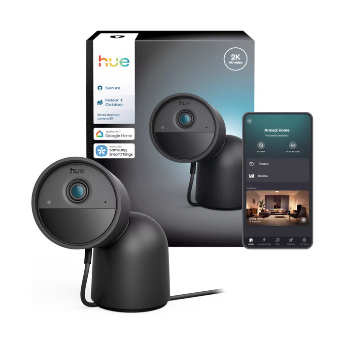 Η Philips Hue Secure 2K Desktop Camera είναι μια ενσύρματη κάμερα ασφαλείας εσωτερικού χώρου που παρέχει καθαρό βίντεο ανάλυσης 2K για την παρακολούθηση χώρων διαβίωσης με λεπτομέρεια τόσο την ημέρα όσο και τη νύχτα. Διαθέτει έξυπνη ανίχνευση κίνησης και αμφίδρομο ήχο, επιτρέποντας ζωντανή επικοινωνία και ειδοποιήσεις μέσω της εφαρμογής Philips Hue όταν ανιχνεύεται δραστηριότητα. Όταν συνδυάζεται με φώτα Philips Hue, η ανιχνευόμενη κίνηση μπορεί να ενεργοποιήσει αυτοματισμούς φωτισμού για βελτιωμένη ορατότητα και αποτροπή. Η κάμερα ενσωματώνεται με το οικοσύστημα Hue για πρόσβαση σε ειδοποιήσεις και εγγραφές εντός της εφαρμογής και περιλαμβάνει μια συμπαγή βάση γραφείου για ευέλικτη τοποθέτηση. Η συνδεσιμότητα δικτύου παρέχεται μέσω Wi-Fi με υποστήριξη για ενσωμάτωση συστήματος Hue.