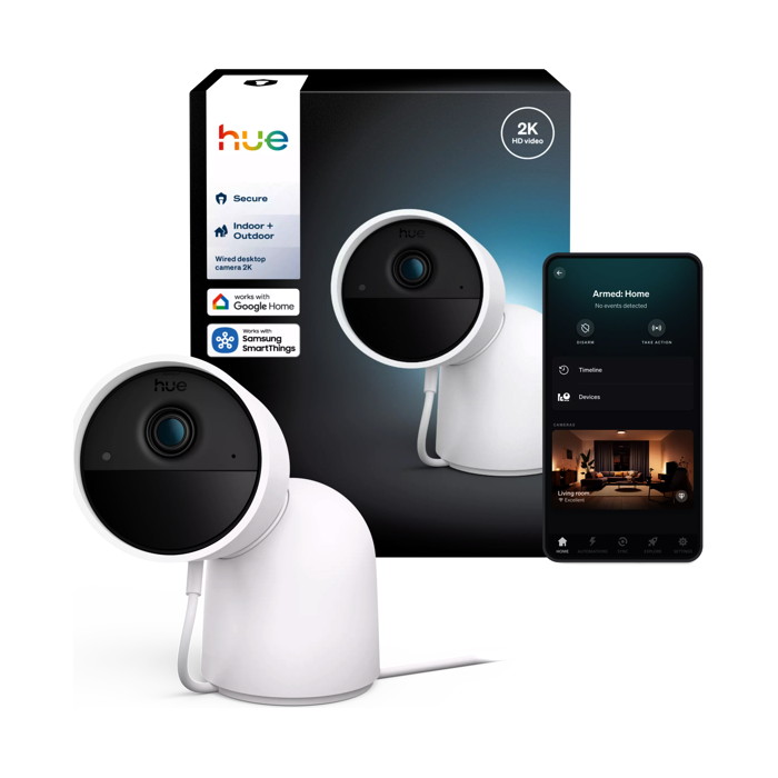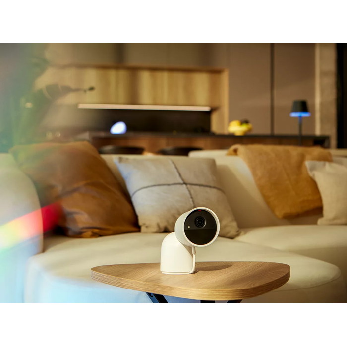Η Philips Hue Secure 2K Desktop Camera είναι μια ενσύρματη κάμερα ασφαλείας εσωτερικού χώρου που παρέχει καθαρό βίντεο ανάλυσης 2K για την παρακολούθηση χώρων διαβίωσης με λεπτομέρεια τόσο την ημέρα όσο και τη νύχτα. Διαθέτει έξυπνη ανίχνευση κίνησης και αμφίδρομο ήχο, επιτρέποντας ζωντανή επικοινωνία και ειδοποιήσεις μέσω της εφαρμογής Philips Hue όταν ανιχνεύεται δραστηριότητα. Όταν συνδυάζεται με φώτα Philips Hue, η ανιχνευόμενη κίνηση μπορεί να ενεργοποιήσει αυτοματισμούς φωτισμού για βελτιωμένη ορατότητα και αποτροπή. Η κάμερα ενσωματώνεται με το οικοσύστημα Hue για πρόσβαση σε ειδοποιήσεις και εγγραφές εντός της εφαρμογής και περιλαμβάνει μια συμπαγή βάση γραφείου για ευέλικτη τοποθέτηση. Η συνδεσιμότητα δικτύου παρέχεται μέσω Wi-Fi με υποστήριξη για ενσωμάτωση συστήματος Hue.