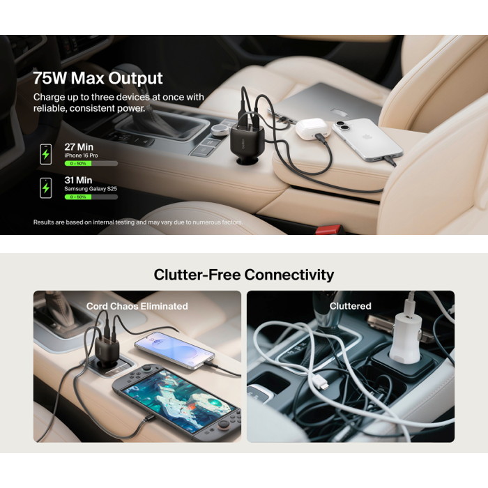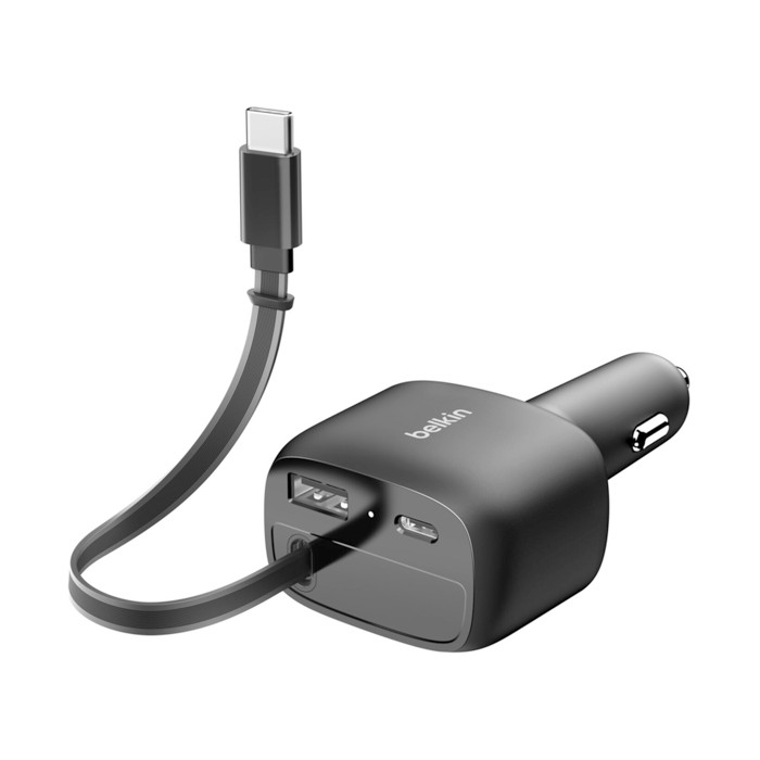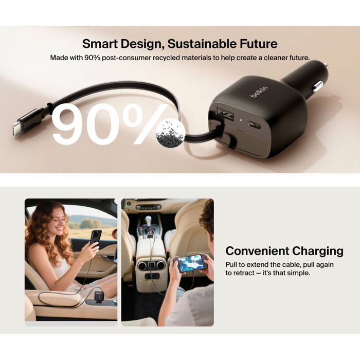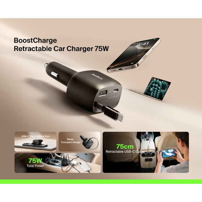 Φορτιστής αυτοκινήτου 75W που διαθέτει ενσωματωμένο αναδιπλούμενο καλώδιο USB-C 75cm μαζί με ειδικές θύρες USB-C και USB-A. Υποστηρίζει τεχνολογία USB-C PD και PPS για γρήγορη φόρτιση φορητών υπολογιστών και smartphone. Η Έξυπνη Κατανομή Ισχύος κατανέμει δυναμικά την ενέργεια σε τρεις συσκευές ταυτόχρονα. Το συμπαγές περίβλημα είναι κατασκευασμένο από 90% ανακυκλωμένο πλαστικό μετά την κατανάλωση και ταιριάζει σε τυπικές πρίζες οχημάτων 12–24V DC.