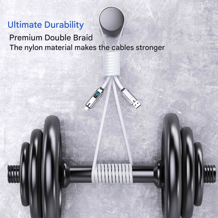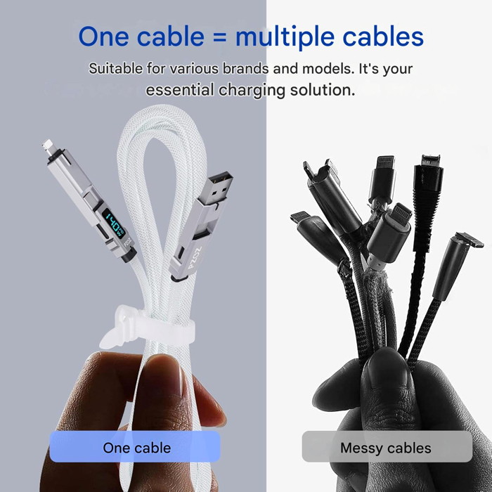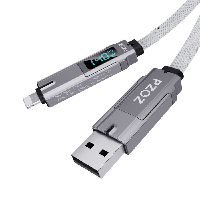 Οθόνη 4 σε 1 & LED: Η σχεδιαστική φιλοσοφία της PZOZ απλοποιεί τη ζωή σας. Συνδυάζει τέσσερις θύρες και μια οθόνη LED σε ένα καλώδιο. USB A σε C, USB A σε Lightning, USB C σε Lightning και USB C σε USB C. Απλότητα και αποτελεσματικότητα.