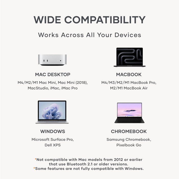Απλή εγκατάσταση, ισχυρή σύνδεση. Συνδέεται άψογα με το Mac ή το PC σας χρησιμοποιώντας Bluetooth 3.0 για αξιόπιστη ασύρματη σύνδεση, χωρίς να απαιτείται dongle. Για σύνδεση με Windows 10, προσθέστε το μέσω των ρυθμίσεων του Πίνακα Ελέγχου.