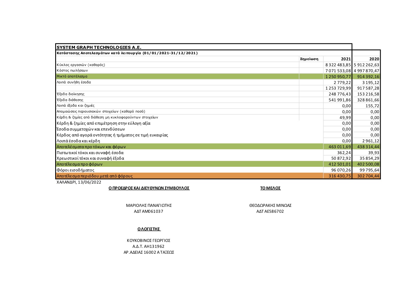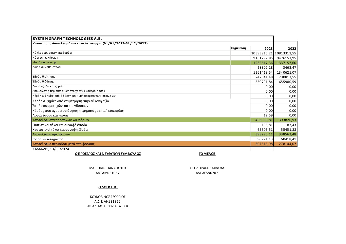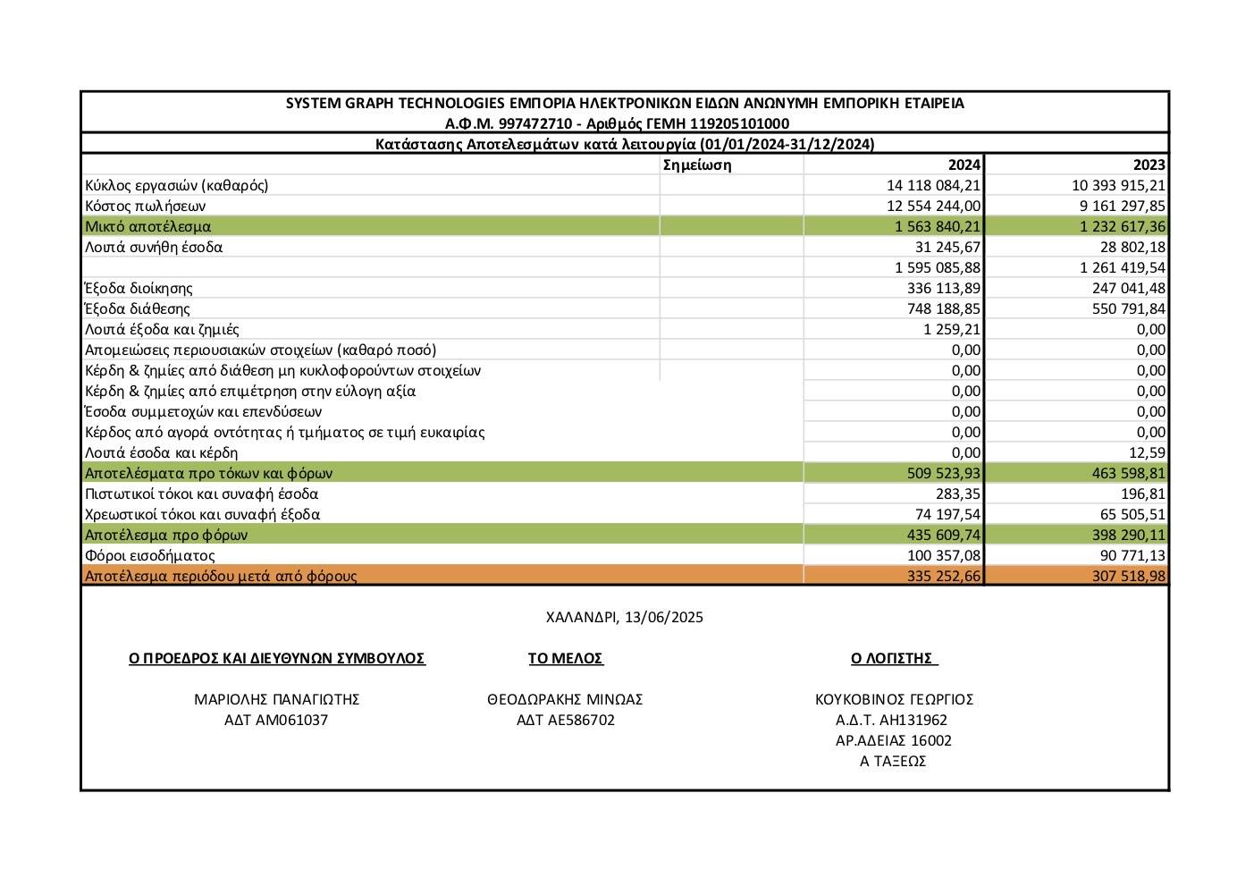 Η System Graph Technologies (iSystem) το 2024 κατέγραψε ενοποιημένες πωλήσεις €14 εκατ., με EBITDA €509 χιλ., κέρδη προ φόρων €435 χιλ. και καθαρά κέρδη €335 χιλ.. Σε σύγκριση με το 2023, οι πωλήσεις αυξήθηκαν κατά 35,8%, η λειτουργική κερδοφορία κατά 10%, ενώ τα κέρδη προ και μετά φόρων ενισχύθηκαν κατά 9%.