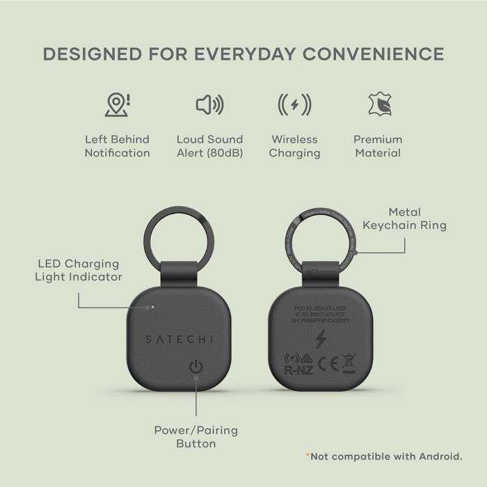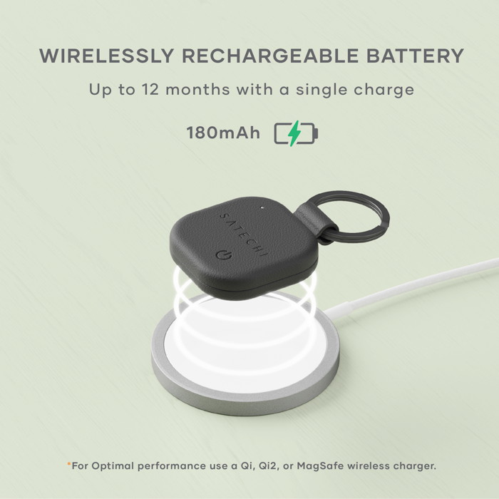 The Satechi Vegan-Leather FindAll™ Keychain is a compact Bluetooth 5.4 tracking accessory compatible with Apple’s Find My network for locating keys, bags, or other items. It measures approximately 3.4 × 3.4 × 0.9 cm and weighs 14.3 g, with a rechargeable 180 mAh battery that can last up to 12 months per charge and supports wireless charging (Qi, Qi2, MagSafe). The unit emits audible alerts (80–90 dB) and offers a Bluetooth range of roughly 10–20 m indoors and 20–50 m outdoors for reliable tracking. Encased in premium vegan leather with a sturdy metal keyring, it combines durable build quality with everyday usability.