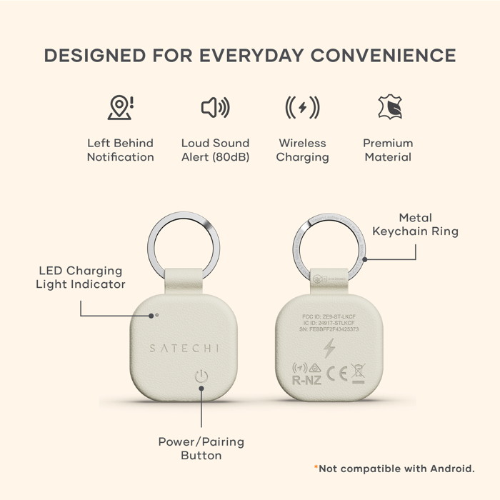 The Satechi Vegan-Leather FindAll™ Keychain is a compact Bluetooth 5.4 tracking accessory compatible with Apple’s Find My network for locating keys, bags, or other items. It measures approximately 3.4 × 3.4 × 0.9 cm and weighs 14.3 g, with a rechargeable 180 mAh battery that can last up to 12 months per charge and supports wireless charging (Qi, Qi2, MagSafe). The unit emits audible alerts (80–90 dB) and offers a Bluetooth range of roughly 10–20 m indoors and 20–50 m outdoors for reliable tracking. Encased in premium vegan leather with a sturdy metal keyring, it combines durable build quality with everyday usability.