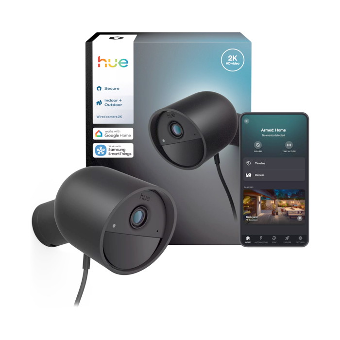 Help protect what matters most with the Hue 2K Wired Security Camera. Crisp, ultra-clear video in 2K – powered by high pixel density – lets you see every detail, day or night. Built for indoor and outdoor use and equipped with smart motion detection, it keeps watch 24/7. Plus, it works seamlessly with your Hue lights to trigger light alarms or turn lights on when activity is detected – turning your entire lighting system into a smart security ally.