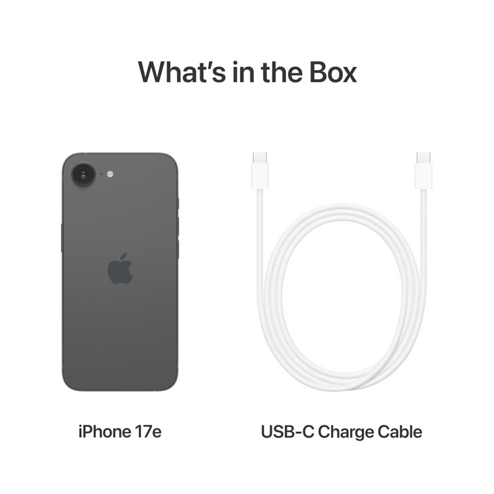 4Charge up to 50% in 30 minutes. Testing conducted by Apple in January 2026 using preproduction iPhone 17e units and software and a USB-C charging cable with Apple 20W USB-C Power Adapter (Model A2305). Fast charging testing conducted with iPhone units with fully discharged batteries. Times measured from the time the Apple logo appears when the unit starts up. Charging time varies based on settings and environmental factors. Actual results may vary.