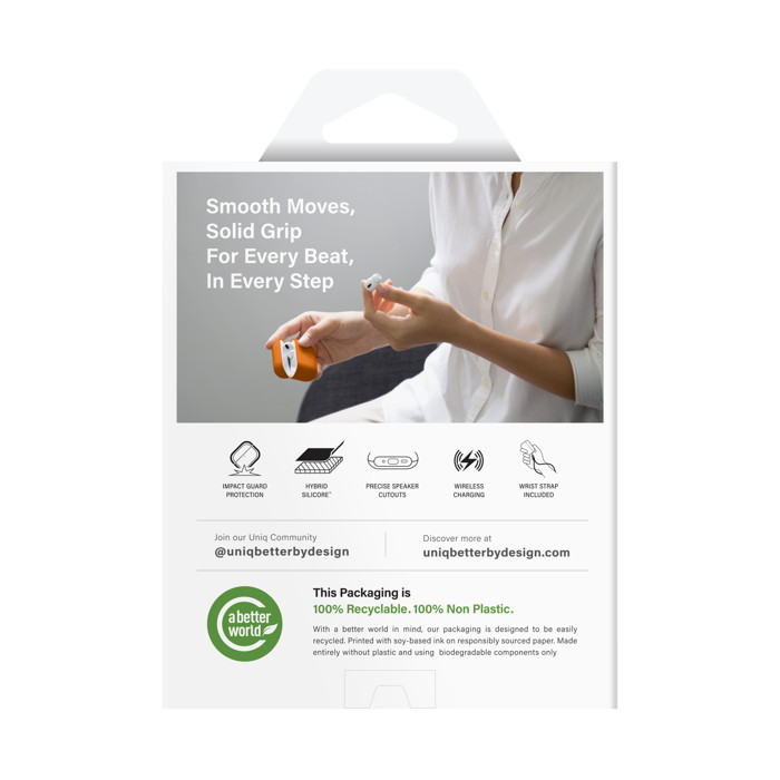 Dual layer hybrid protection. High quality liquid silicone and the latest coating technology to reduce dust adsorption, anti-fingerprint, anti-smudge. Premium soft touch. Precise cutout for speakers at bottom, & side loop for handstrap/lanyard, support both wired and wireless charging. Includes a Uniq handstrap.