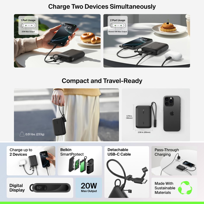 Charge up to 20W with our BoostCharge Power Bank 10K with Display. Your devices stay powered throughout the day with two USB-C ports and one detachable USB-C cable. Charge with a maximum power of 20W when a single port is in use, and a total of 15W when both ports are being used. A convenient digital screen indicates the battery level.