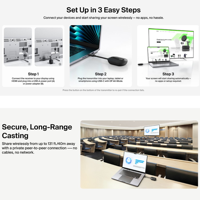 - Wirelessly screenshare extended or mirrored at 1080p@60Hz in large spaces.