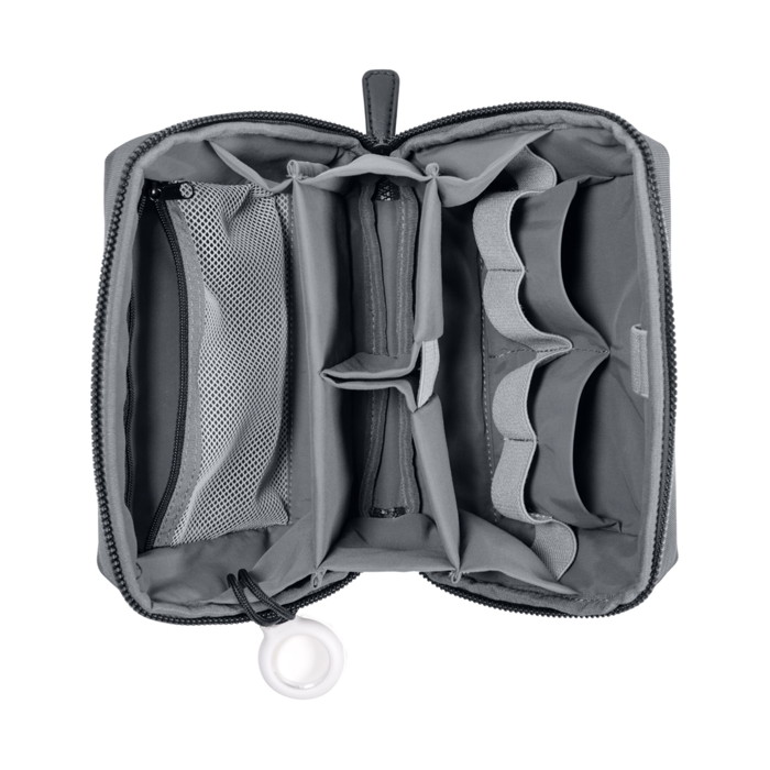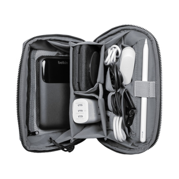 • Smaller compartments neatly organize compact chargers, phone accessories and cables.